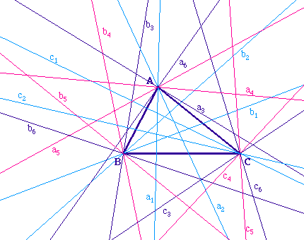 Il en résulte qu'un triangle possède 18 trissectrices. Les ^trissectrices des illustrations et figures des pages suivantes auront toujours les mêmes couleurs, ce qui permet de les repèrer rapidement.