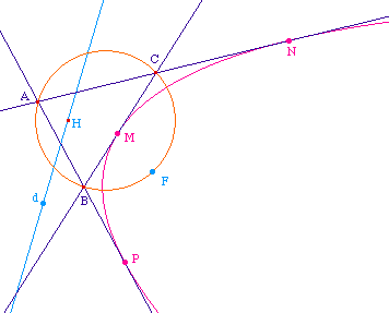 Soient alors trois tangentes issues de trois points M, N et P d'une parabole de foyer F et de directrice d. On sait que les symétriques de F par rapport à chaque tangente appartient à la directrice. Ils sont donc alignés, et ainsi F appartient au cercle circonscrit au triangle ABC formé des intersections des tangentes prises 2 à 2, et la directrice est la droite de Steiner pour le triangle ABC associé au foyer de la parabole. La directrice passe donc par l'orthocentre du triangle.